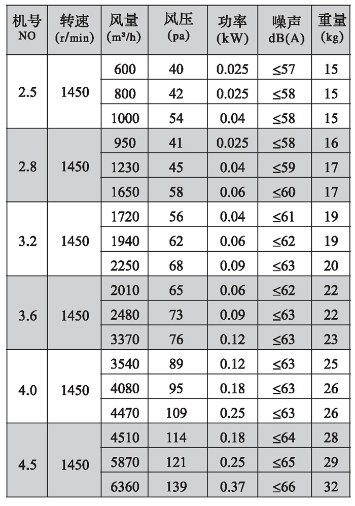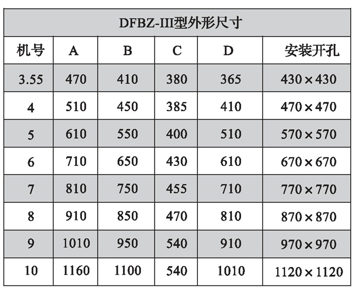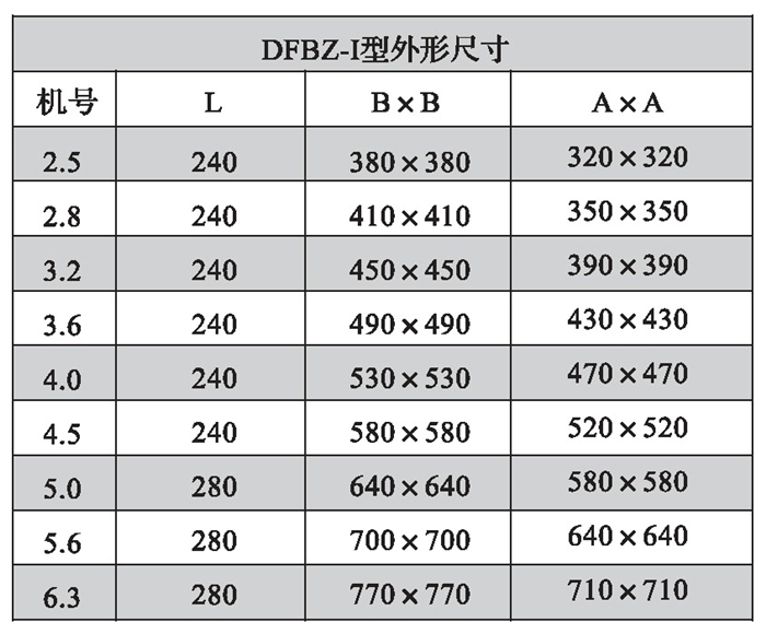 三、DFBZ型風(fēng)機(jī)外形尺寸表(單位: mm)