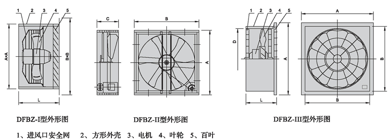 DFBZ-I型為采用內(nèi)轉(zhuǎn)子電機(jī)直聯(lián)傳動結(jié)構(gòu)形式、DFBZ-Ⅱ型采用內(nèi)轉(zhuǎn)子電機(jī)、皮帶傳動結(jié)構(gòu)形式,DFB-Ⅲ型為采用外轉(zhuǎn)子電機(jī)直聯(lián)傳動結(jié)構(gòu)形式??筛鶕?jù)用戶要求制威防腐防爆型。